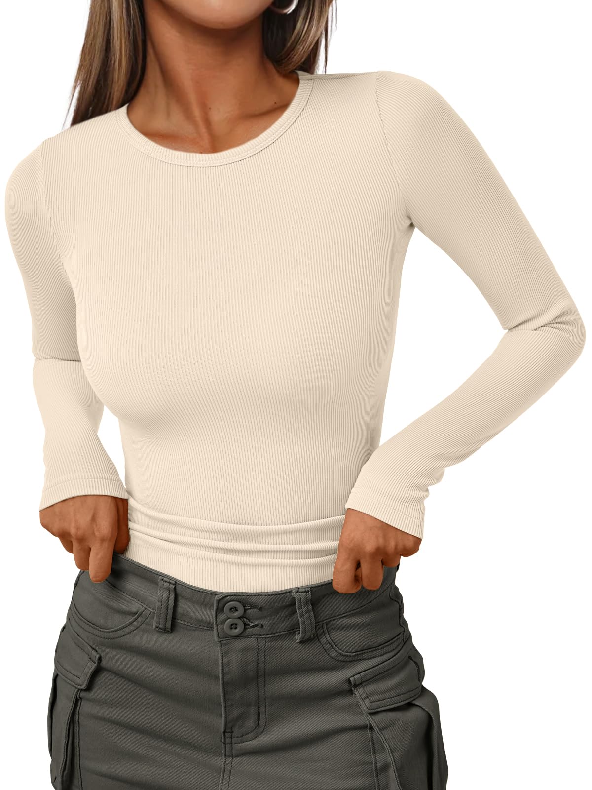 AUTOMET Womens Ribbed Shirts Crewneck Fitted Tops Casual Underscrubs Layer Slim Basic T-Shirts.