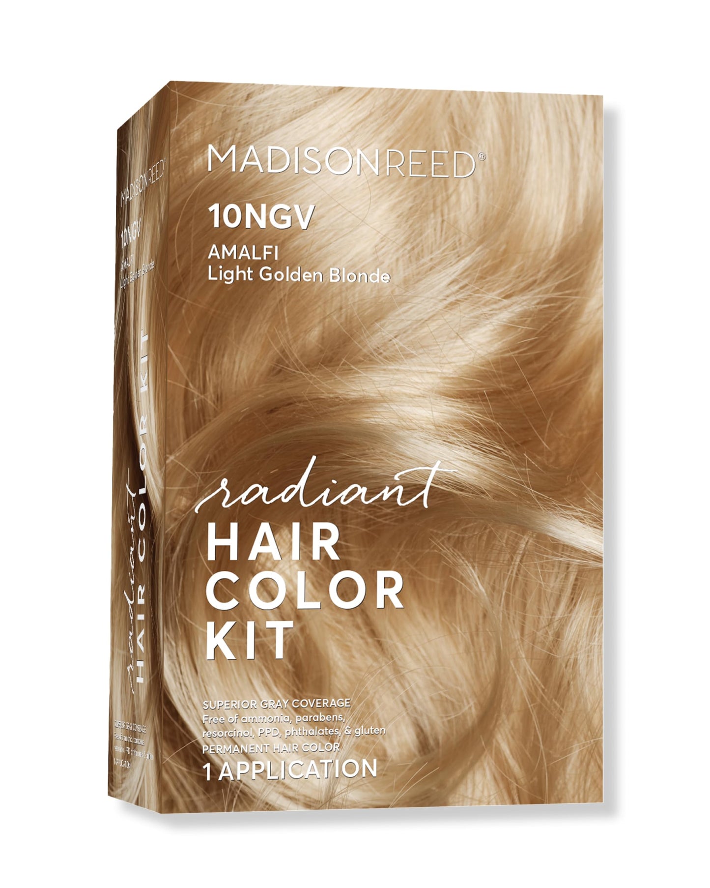 • The Madison Reed Radiant Hair Color Kit is available in a light golden blonde shade, 10NGV Amalfi Blonde.
